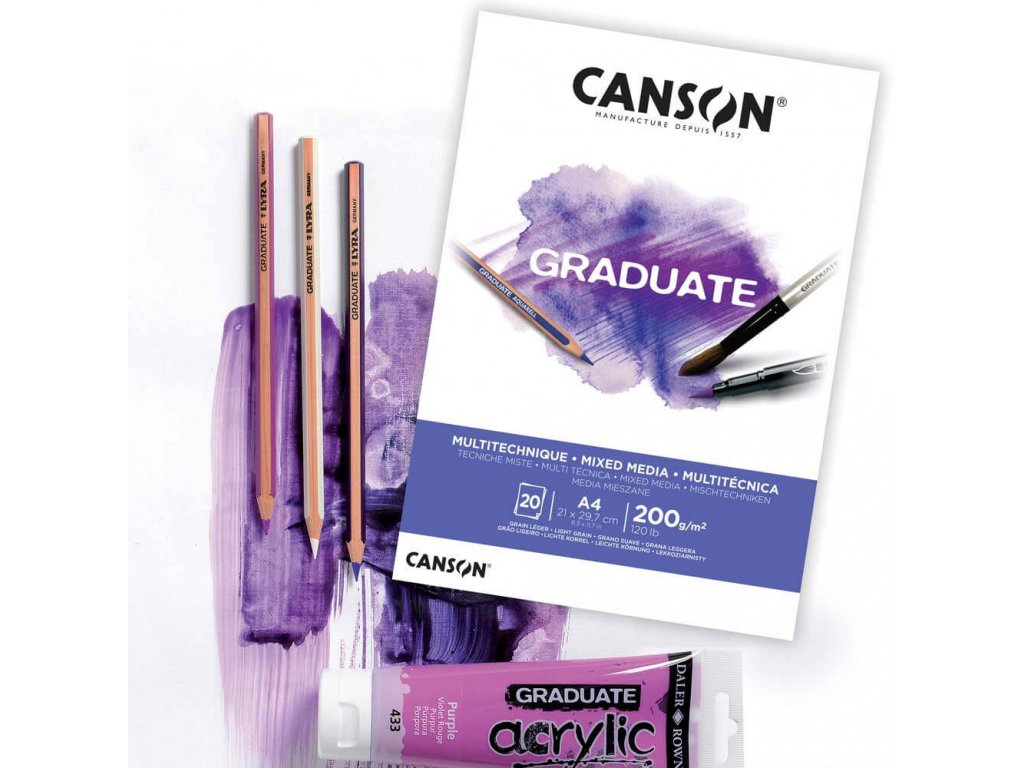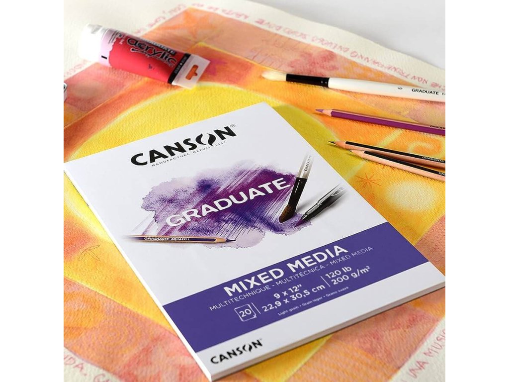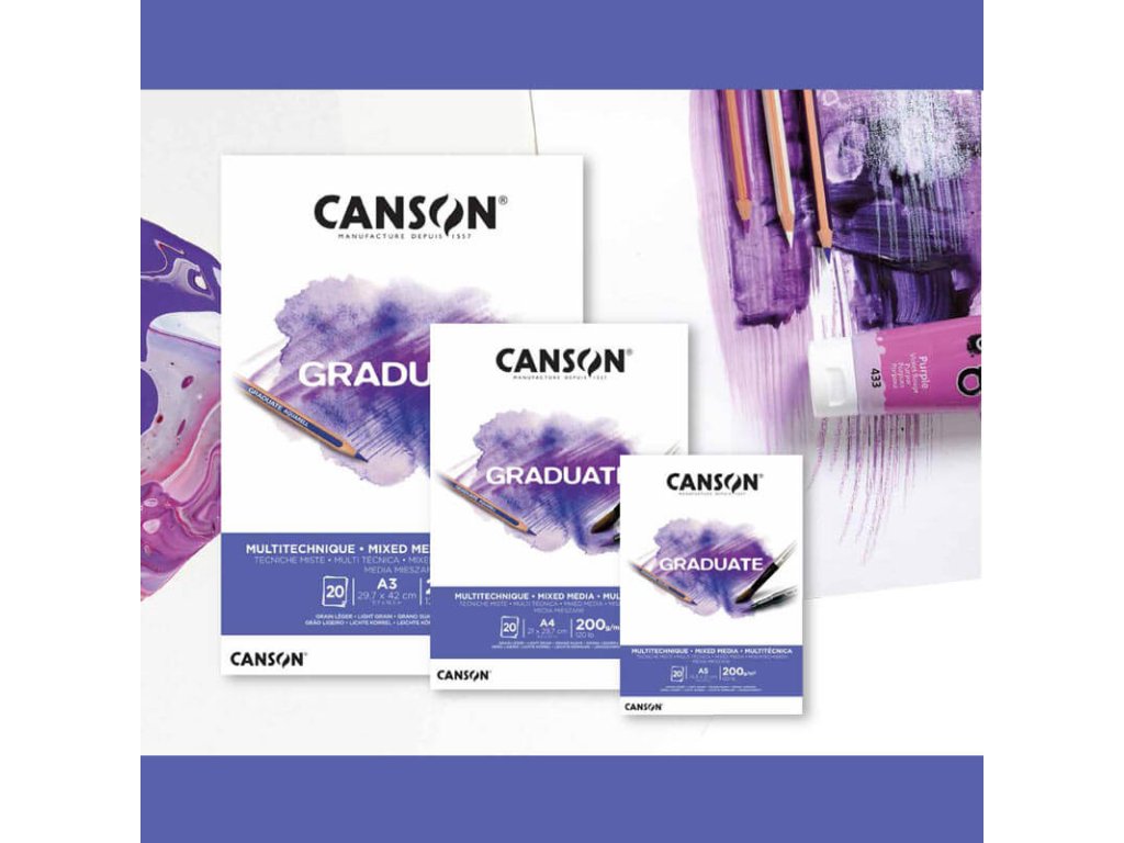 Canson Graduate Mix Media White je skicák s bílým papírem, který je ideální pro smíšené, tedy suché i mokré techniky. Papír je jemně zrnitý. Formát lepeného bloku je A4. Obshauje 30 listů o gramáži 200g.