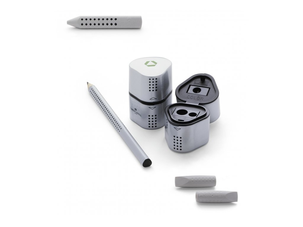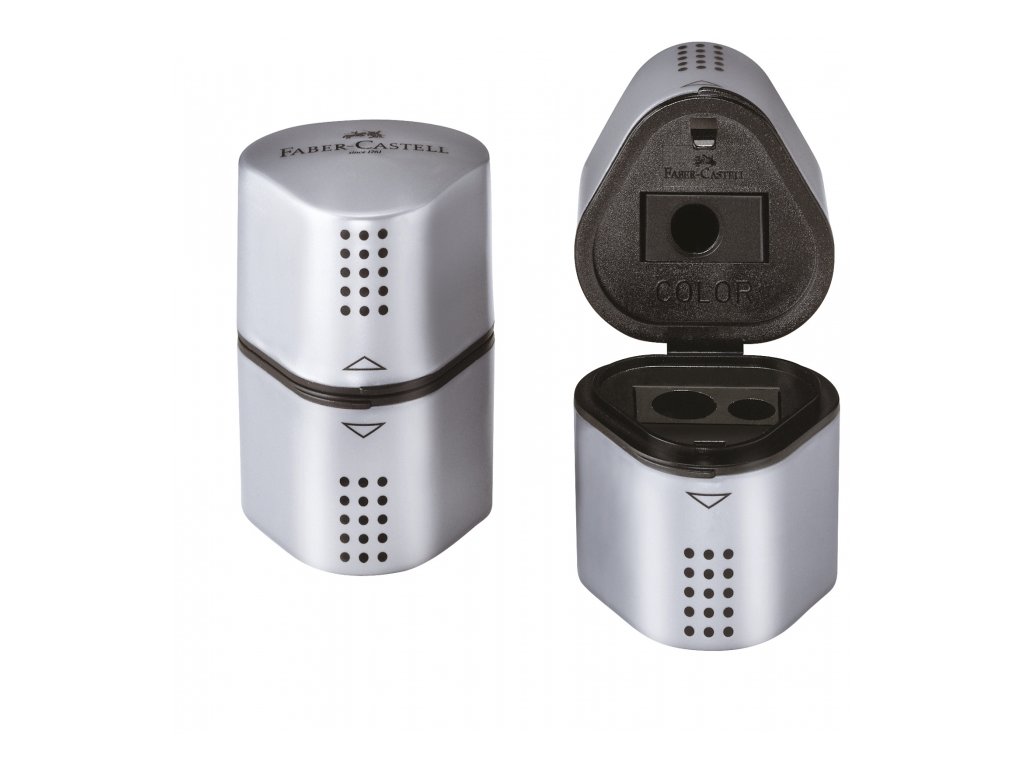 Oboustranné otevírací ořezávátko se zásobníkem Faber Castell Grip 2001. Kvalitní plastové ořezávátko s velmi ostrými nožíky, které nelámou tuhu. Ořezávátko má jeden otvor na klasické tužky a pastelky na jedné straně a dva otvory na klasické i silné tužky na druhé straně.