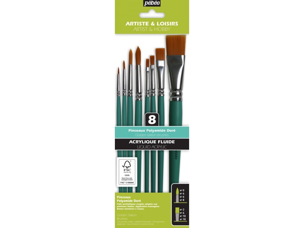 Sada 8 ks krátkých štětců vhodných zejména pro akrylové, temperové, ale i olejové barvy. Syntetický vlas - žlutý polyamid. Složení sady - plochý 2, 4, 10, 18; kulatý 0, 4, 6, 8