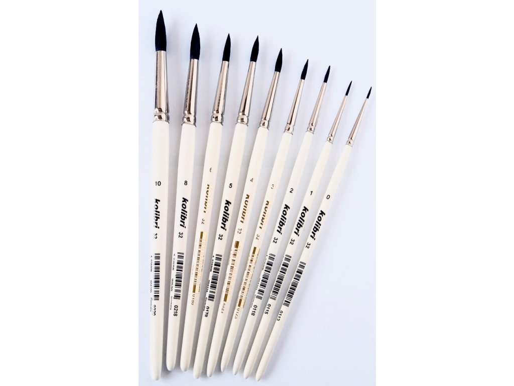Kulaté přírodní štětce série Kolibri 32 jsou vhodné pro malování na hedvábí a textil. Také na vodové barvy, akvarelové barvy, inkousty a podobná řídká média. Vlasy štětce jsou černé chlupy z uší hovězího dobytka. Jedna se tedy o savý štětec se smáčivým vlasem. Tvar štětin je kulatý, zašpičatělý. Štetec má poniklované kování a krátkou bílou nebo červenou lakovanou rukojeť.